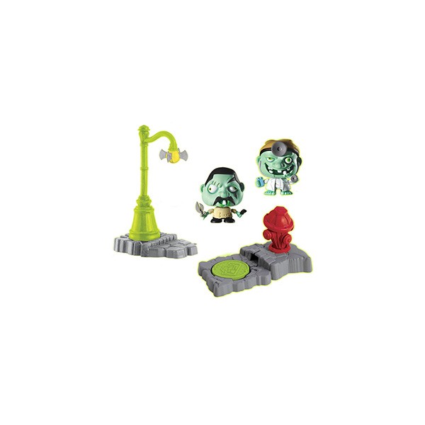 The evil Mayor has taken over the Zity and has turned all the Zitizens into Zombies! Contains: 6 x Flip Out Fire Hydrant Traps (with Swobblerz Zombie figure, Zombie ID code card, Manhole cover and brochure) and 6 x Drop & Chop Lamp Post (with Swobblerz Zombie figure, Zombie ID code card, Manhole cover and brochure)